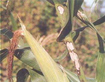 癥狀 紋枯?。ㄋ追Q"花腳稈","爛稈瘟")是近年來發(fā)生危害日益嚴(yán)重的一種新病害。四川省各地均有發(fā)生,以高溫、高濕條件下和夏播玉米發(fā)病較嚴(yán)重。其寄主甚廣,除危害玉米外,還可侵染水稻、小麥、大麥、高粱、棉花、大豆等多種作物。該病主要危害葉鞘,也可侵染葉片、苞葉和果穗,玉米拔節(jié)至成熟期均可發(fā)病。開始從莖基部的葉鞘感病,后侵染葉片并向植株上部蔓延。發(fā)病初期,光出現(xiàn)水漬狀灰綠色圓形或橢圓形病斑,后轉(zhuǎn)為白色至淡 黃色,發(fā)病后期,變?yōu)榧t褐色云紋狀斑 塊。當(dāng)濕度較大時(shí),病斑上常長出許多白霉(菌絲和擔(dān)孢子);當(dāng)溫度較高或植株已老健不適合病菌擴(kuò)大危害時(shí),即產(chǎn)生菌核,多藏于葉鞘內(nèi)。菌核初為白色,老熟時(shí)呈褐色。葉鞘受害后,葉片萎蔫,嚴(yán)重時(shí)整株枯死,果穗受害后,可使苞葉干枯,果穗腐爛。